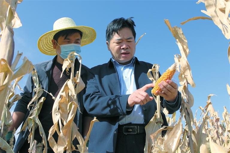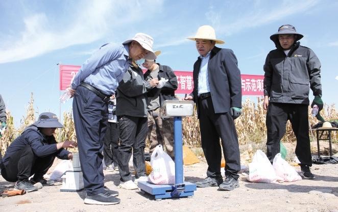 放眼望去,在戈壁滩上覆土改良的560亩制种玉米田一片金黄,“土肥水药技术集成+农事服务”对照区和托管区标识牌赫然在目。马银山、肖占文简要介绍了测产方法和注意事项,随后专家们分组进入玉米地开始取样。