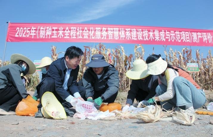 车行至柳树寨农场,河西学院、张掖市种子管理局、张掖市农科院等单位的专家们汇合,共同开始2025年《制种玉米全程社会化服务智慧体系建设技术集成与示范》项目测产评价。