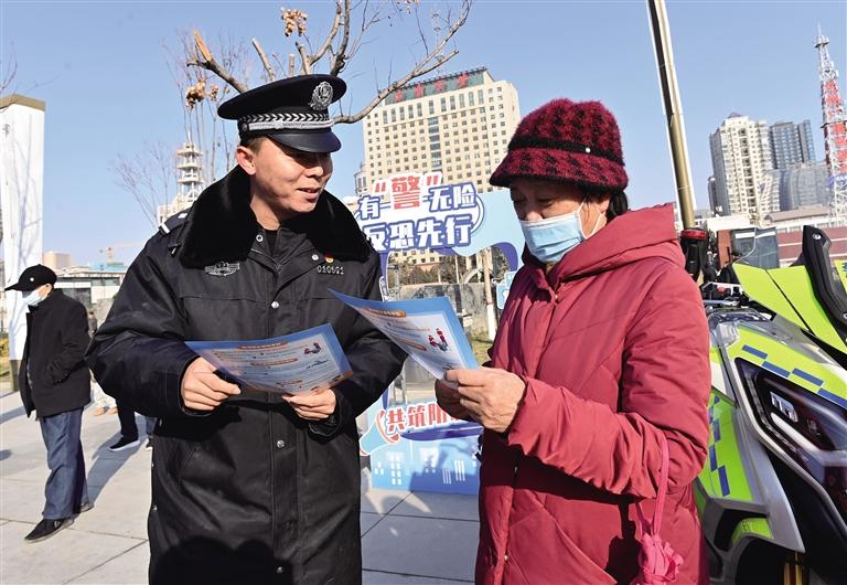 民警向市民发放《反恐怖主义法》、公民防范手册