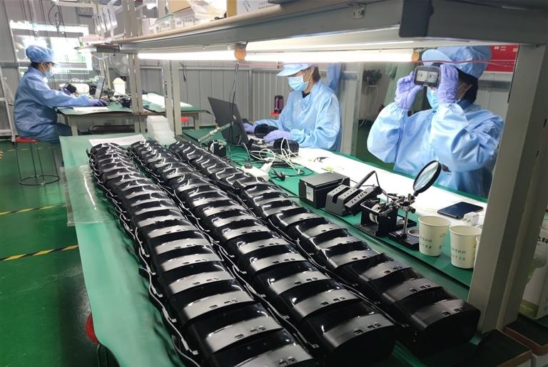 无尘车间内,工人着防护装备对医疗器械设备进行组装检测